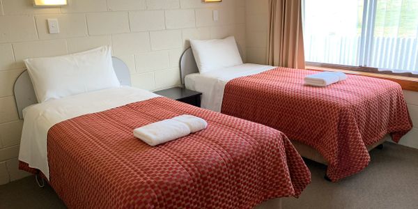 Two single beds, electric blankets, cupboard, bedside table, bedside lamps.